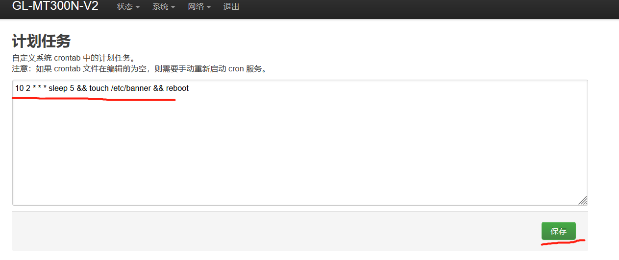 填完后点击保存,重新再进下界面,如果命令还在,说明可以了,定时任务在运行;如果没有,请安上方提示重启下服务。这里我们最好手动重启下路由器,否则可能定时任务不起作用。