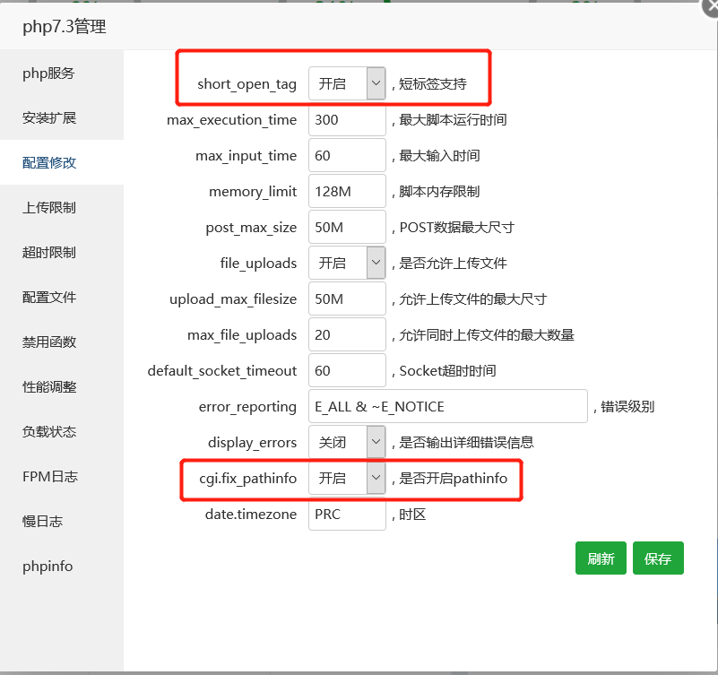 1、检查PHP设置中是否开启短标签和pathinfo,如下图: