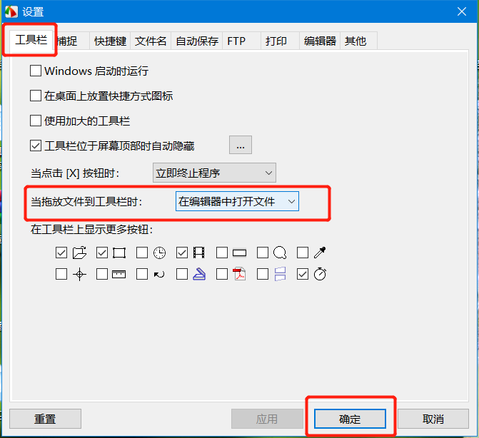 打开后选择工具栏-当拖放文件到工具栏时按下图设置,最后确定。