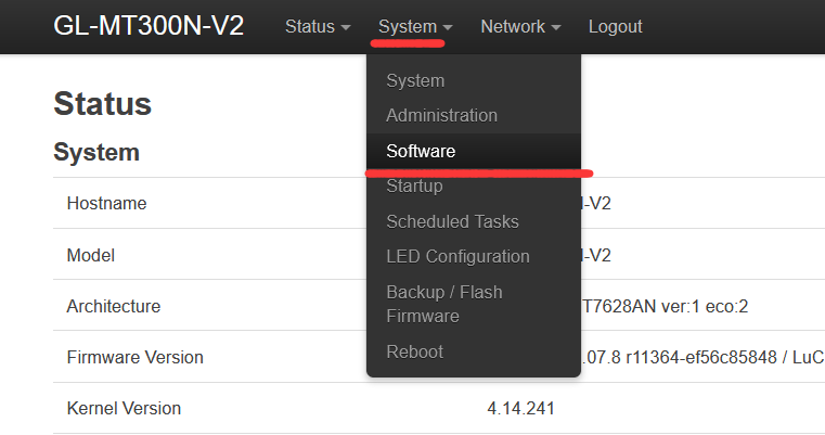 可以看到,系统版本为OpenWrt 19.07.8,我们点击上方的System选项卡,选择里面的Software,