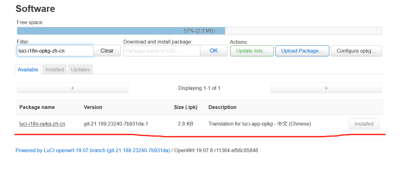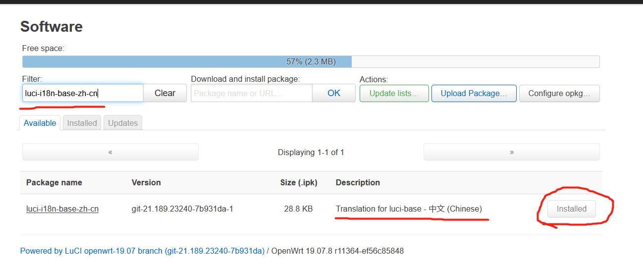 luci-i18n-base-zh-cn无需回车,页面自动把相应的软件包筛选出来了,我们直接点击Install(因为我已经安装了,所以显示Installed)。