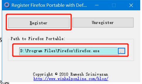 下面,我们打开本次要用到的软件Register Firefox Portable with Default Programs,先在下面设置好火狐的主程序路径,然后点击Register.