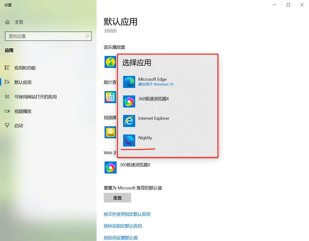 可以发现,浏览器默认程序中没有火狐,即使我已经在火狐软件中点击了设置默认浏览器。