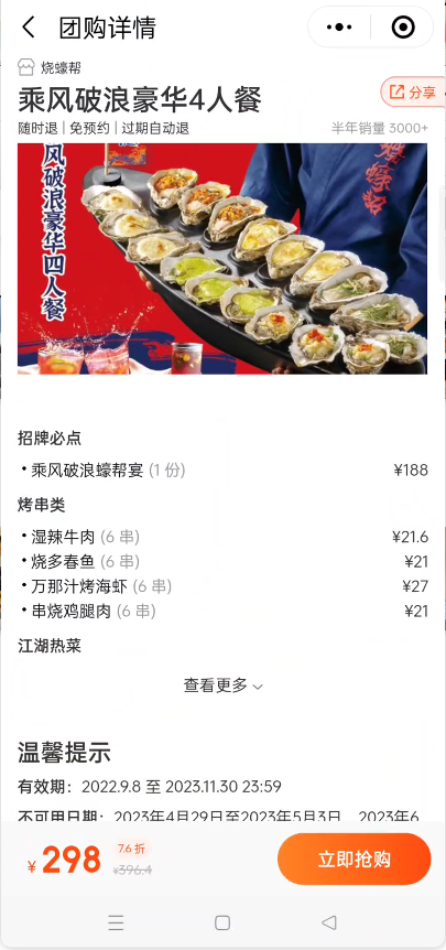 ,一共298元(美团),上菜后感觉2个人吃还是有点吃力的,不过从价格上来说还是比较实惠的,乘风破浪一共18个,口味各异,非常鲜美没有一点腥味,确实厉害,生蚝个头也大,来了必须试一试,不然亏大了。