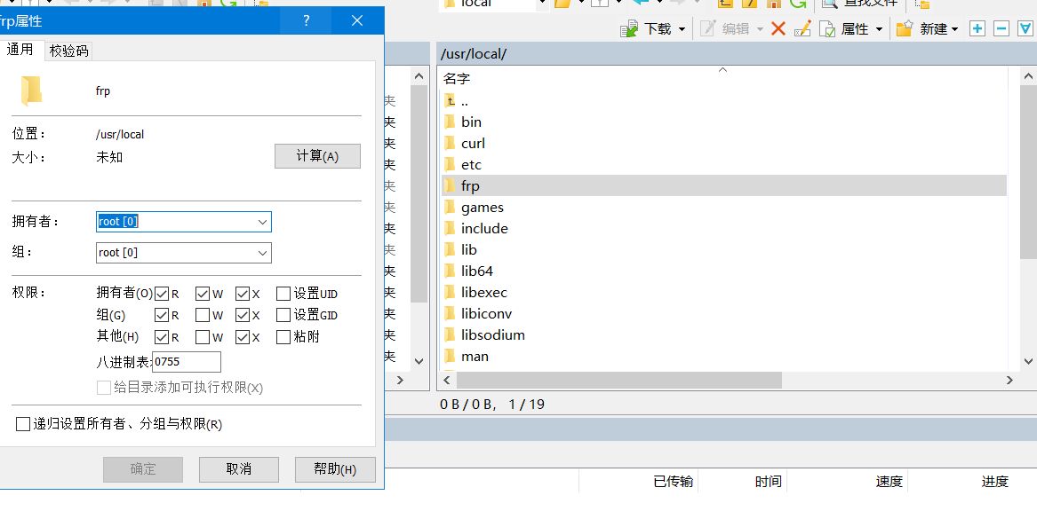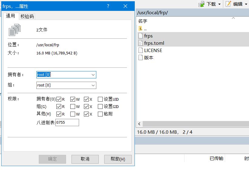 frps.toml我在/usr/local下新建了frp文件夹,我准备把它安装在这里,所以上传到这个文件夹,注意文件夹拥有者及组,都要选root,因为后面SSH登录服务器执行命令的用户名就是root,如果后面程序无法启动,可以检查下是不是这里出错了。