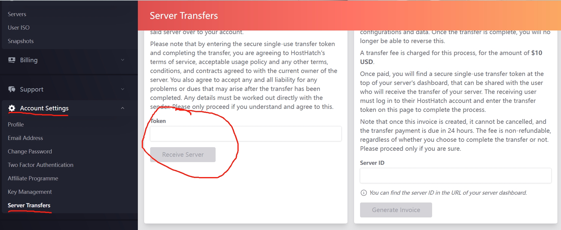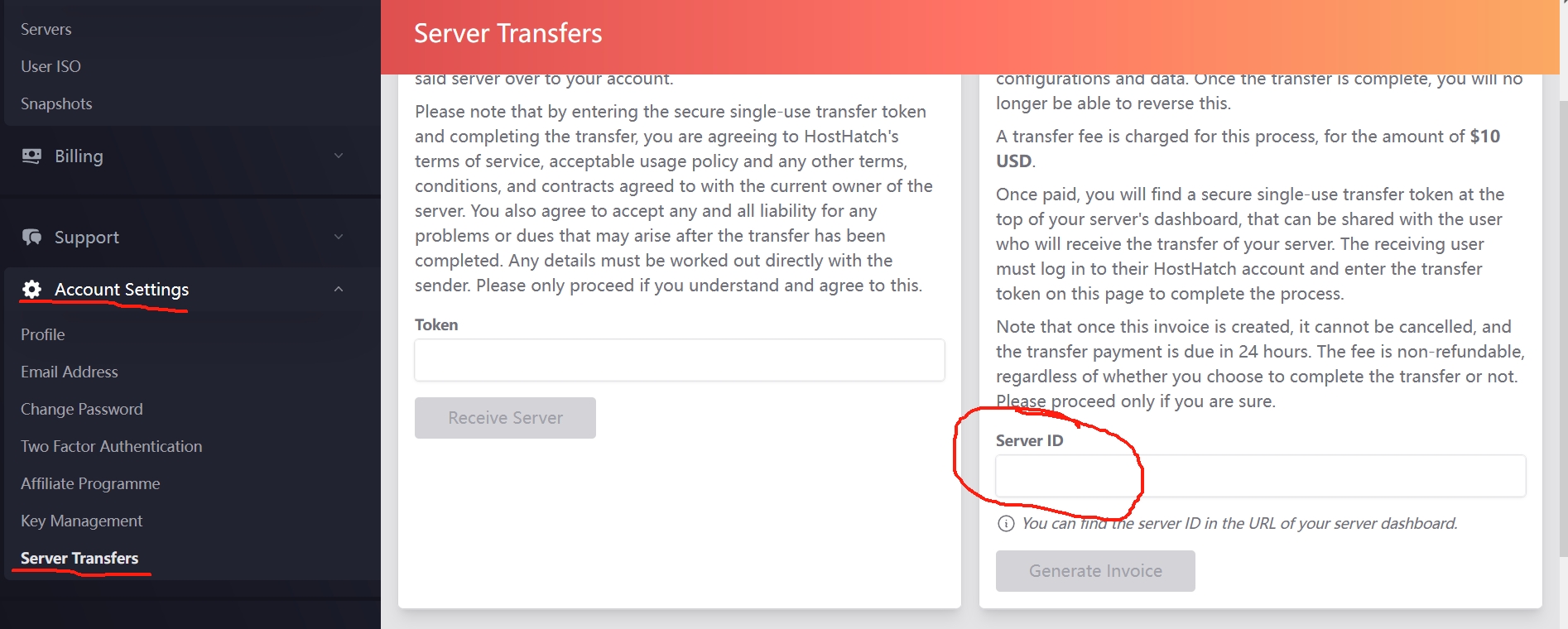 https://cloud.hosthatch.com/servers/1267***那个后面的数字,就是这台机器的ID,把这个ID填到刚才的转移的地方,点击按钮后,他会提示你需要支付10美元转移费,你点OK就行,然后到左边Billing把账单支付了。
